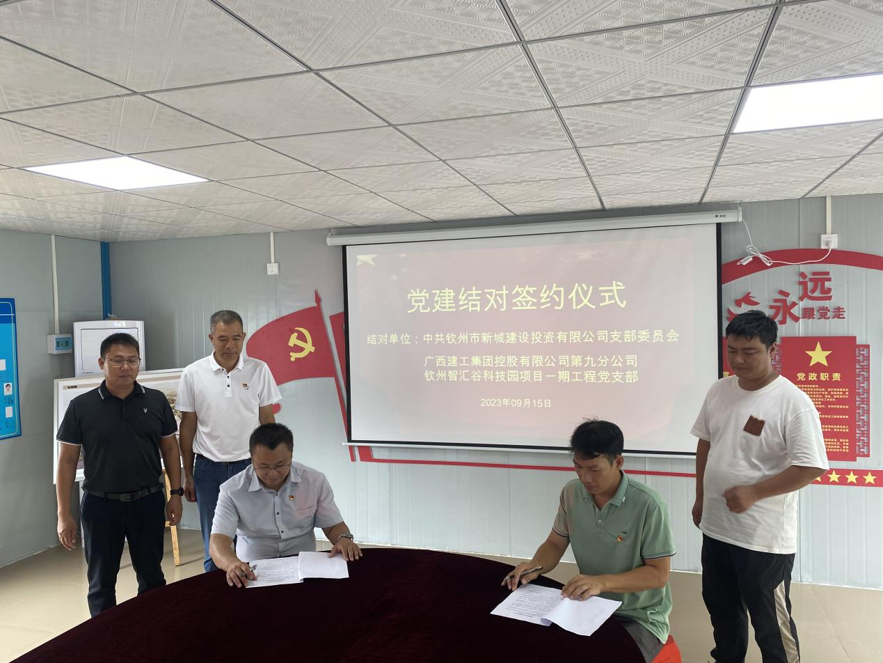 為充分發(fā)揮黨建引領作用,護航項目建設質(zhì)量、安全生產(chǎn),促進市重點項目建設提速增效,2023年9月15日,建投公司黨支部與廣西建工集團欽州智匯谷科技園項目一期工程黨支部舉行黨建結對共建協(xié)議簽約儀式。集團公司副總經(jīng)理、建投公司黨支部書記劉雙,欽州智匯谷科技園項目一期工程項目經(jīng)理劉鐘明等出席簽約儀式并簽約。