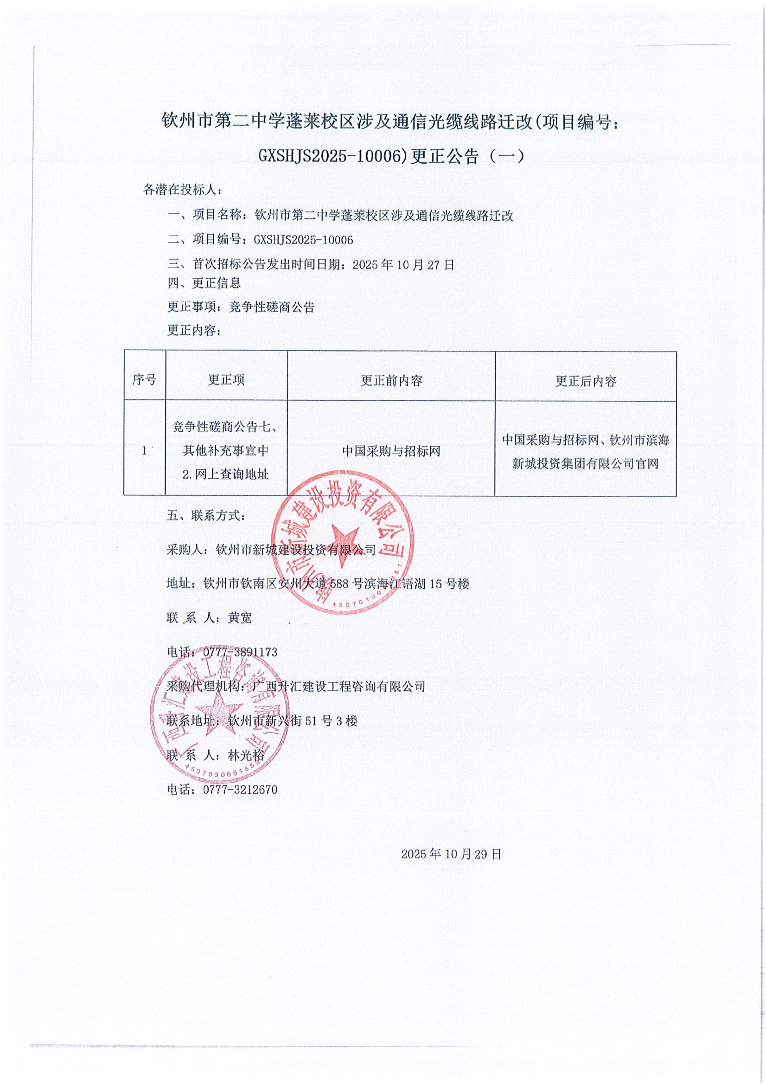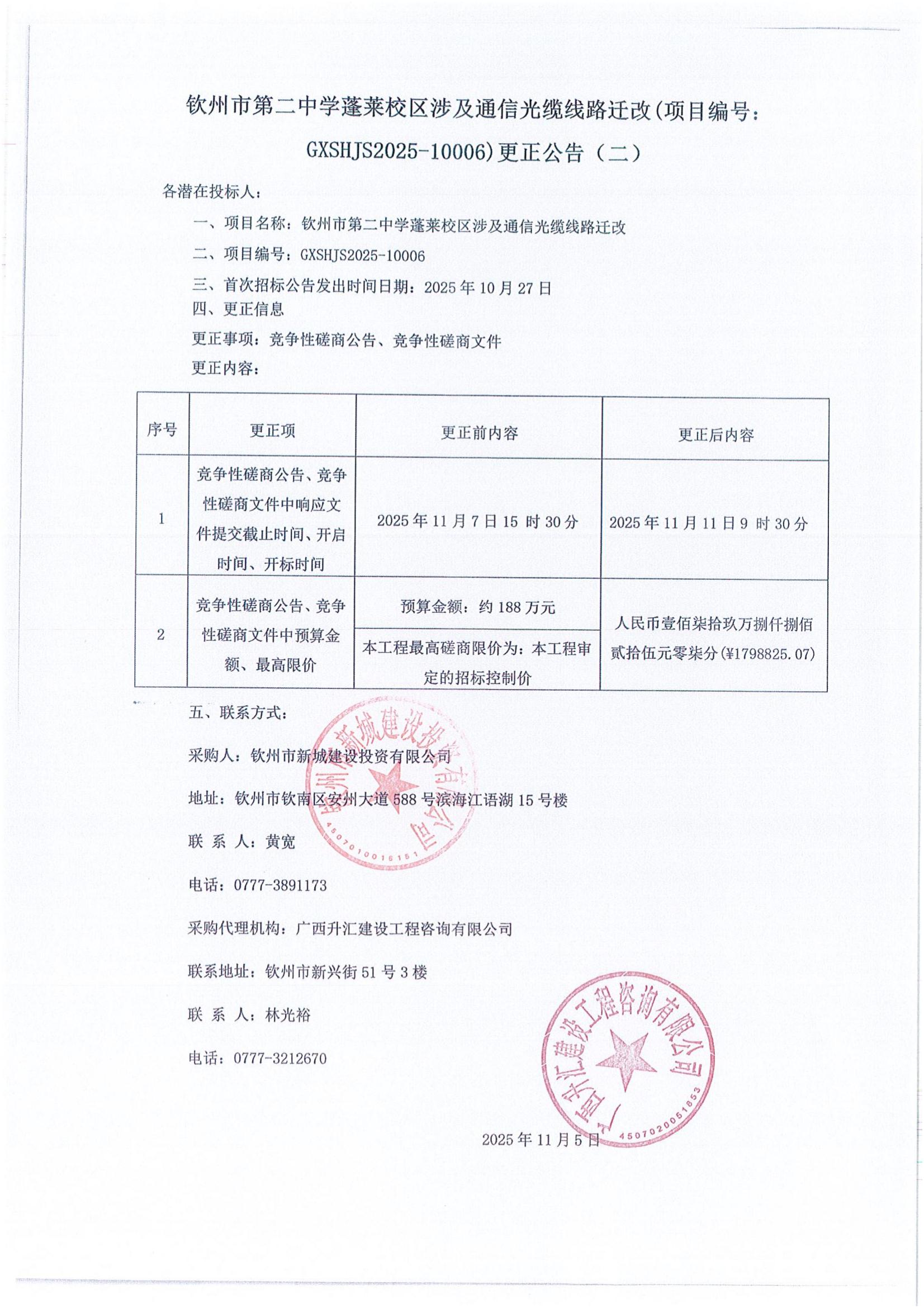欽州市第二中學(xué)蓬萊校區(qū)涉及通信光纜線路遷改(項(xiàng)目編號(hào): GXSHJS2025-10006)更正公告(一)