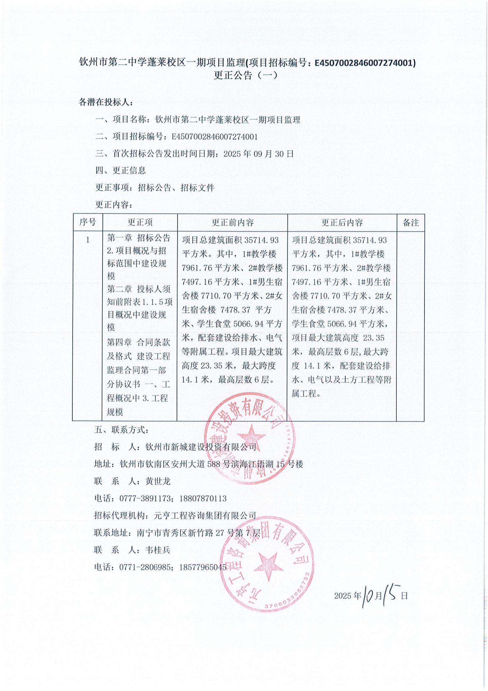 欽州市第二中學(xué)蓬萊校區(qū)一期項目監(jiān)理(項目招標(biāo)編號:E4507002846007274001)更正公告(一)