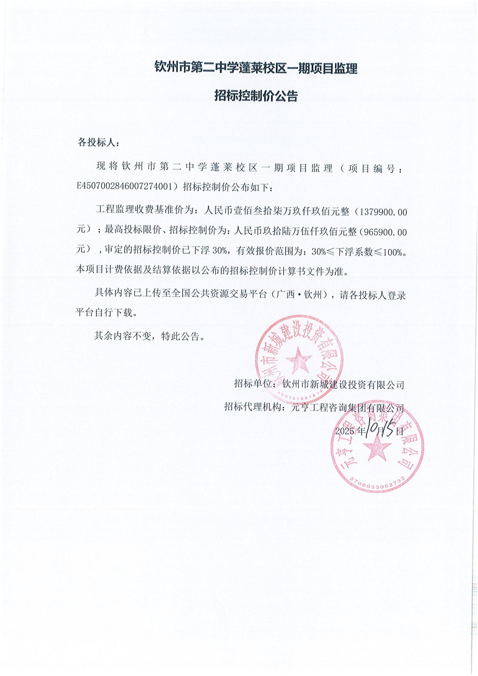 欽州市第二中學(xué)蓬萊校區(qū)一期項目監(jiān)理招標(biāo)控制價公告