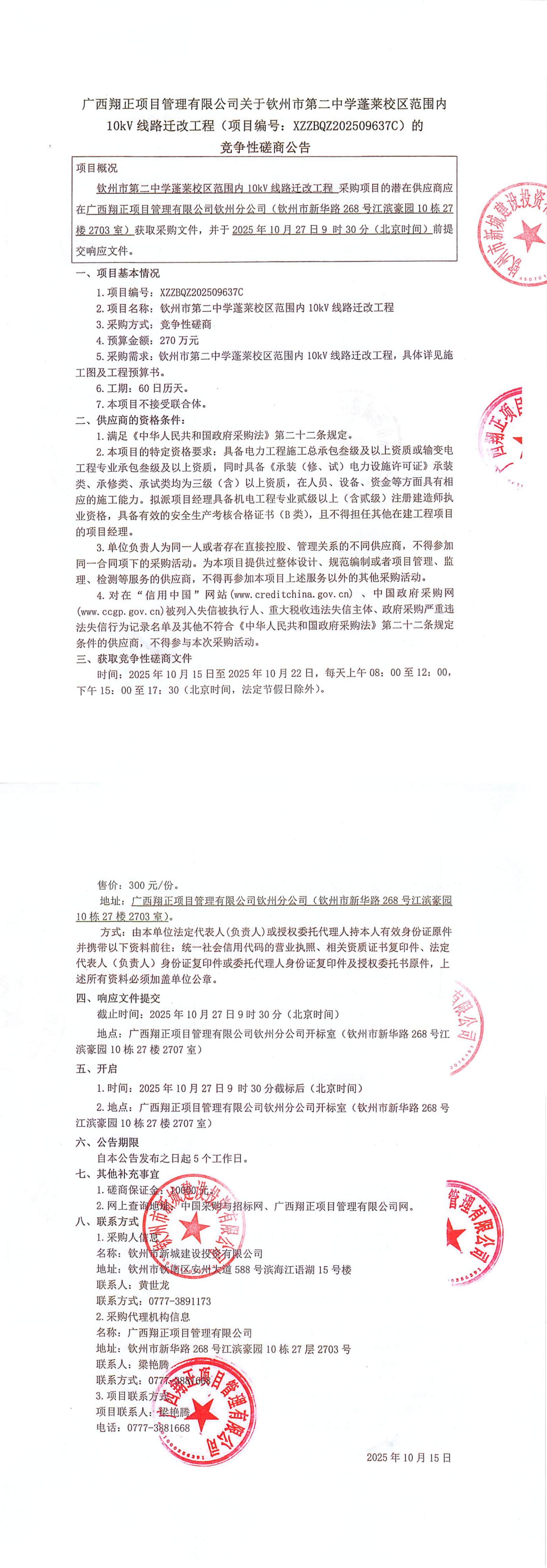 廣西翔正項目管理有限公司關(guān)于欽州市第二中學(xué)蓬萊校區(qū)范圍內(nèi)10kV線路遷改工程(項目編號:XZZBQZ202509637C)的競爭性磋商公告