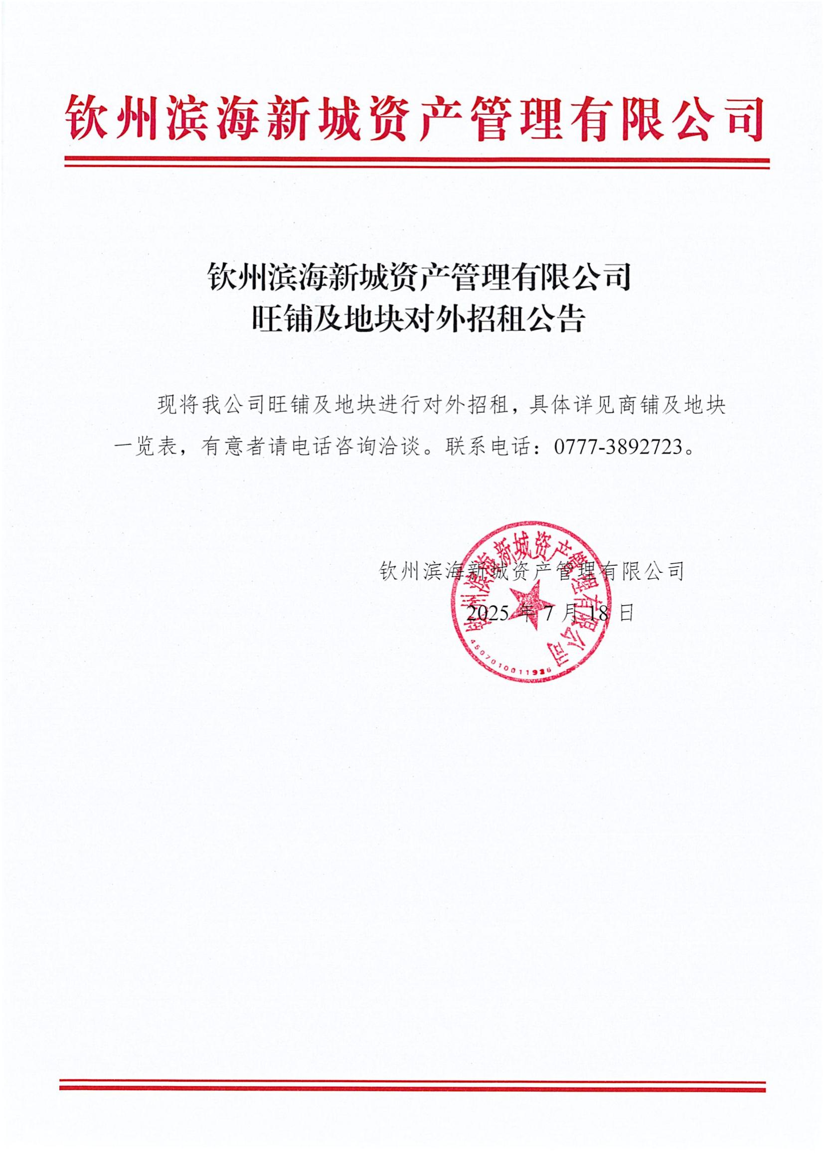 欽州濱海新城資產(chǎn)管理有限公司旺鋪及地塊對外招租公告