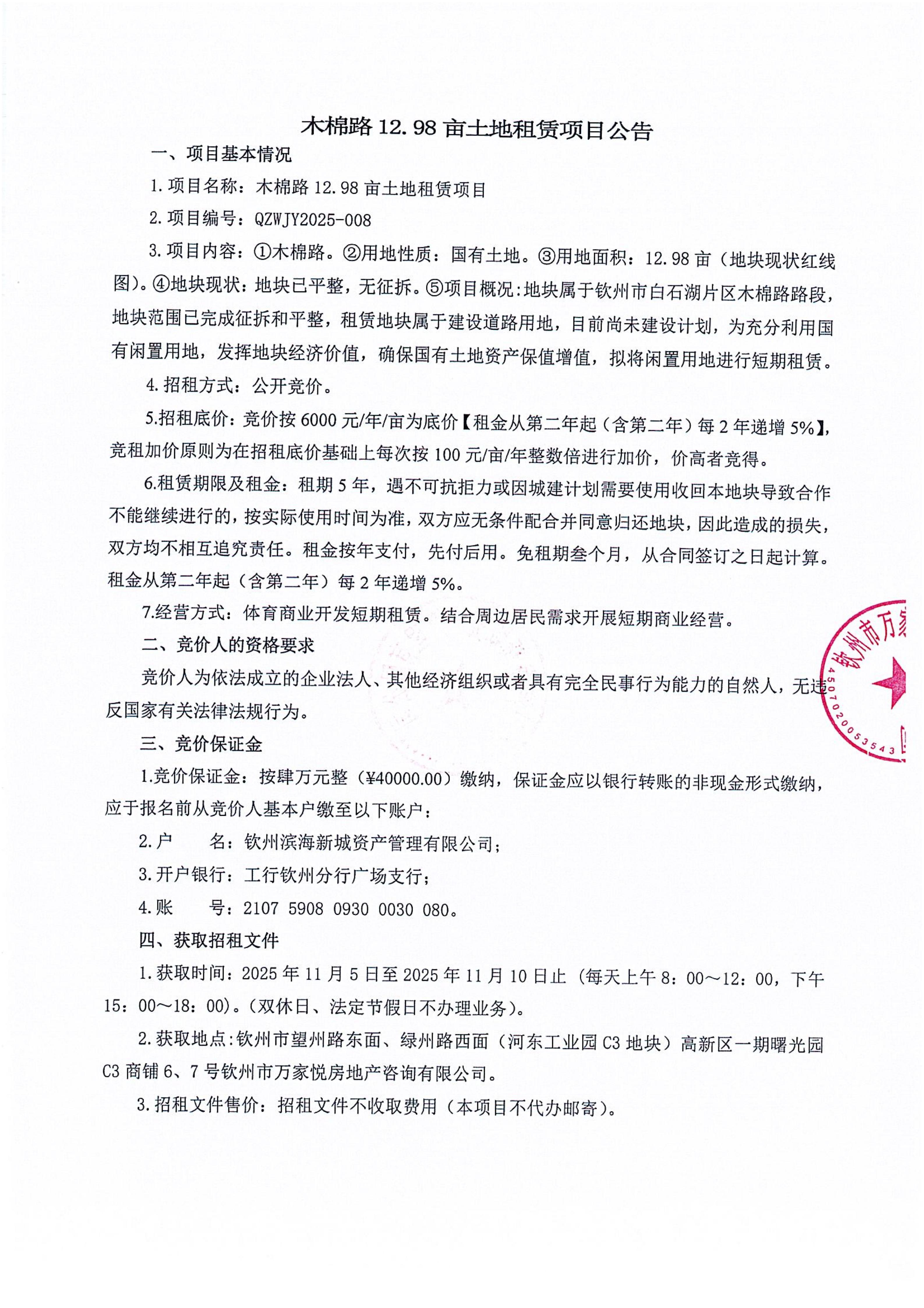 欽州市北部灣大學東北面6畝地塊公開招租項目