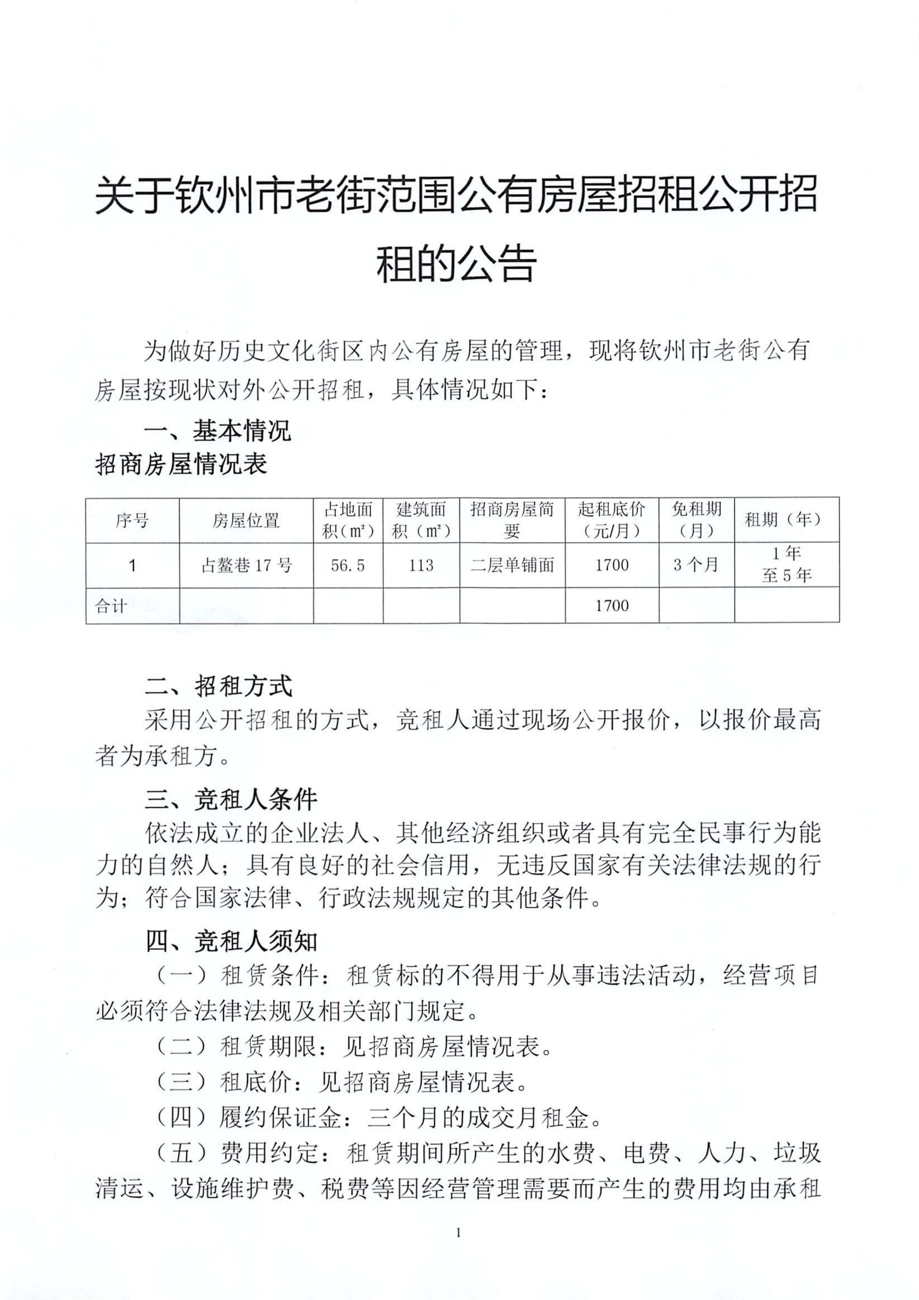 關于欽州市老街范圍公有房屋招租公開招租的公告(占鰲巷67號)