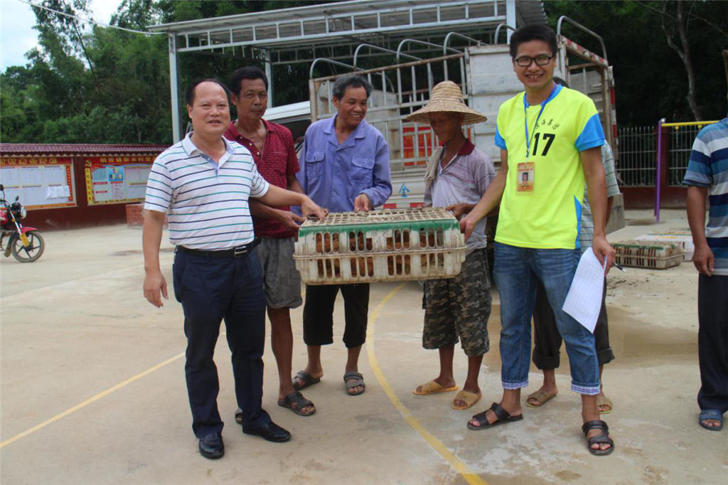 (圖為集團(tuán)公司副總經(jīng)理?xiàng)钚聴潪樨毨舭l(fā)放雞苗)