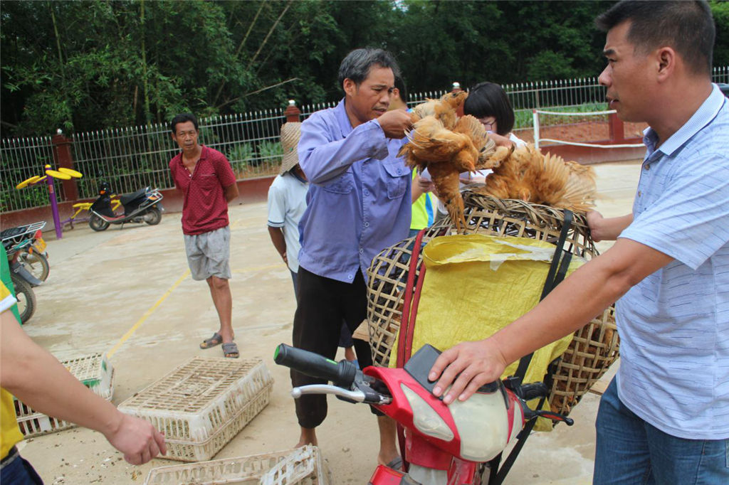 當(dāng)天上午,運(yùn)送雞苗的貨車從欽州市出發(fā),經(jīng)過1個(gè)小時(shí)的行程來到了靈山縣伯勞鎮(zhèn)新禾村公共服務(wù)中心,此時(shí),貧困戶們已經(jīng)滿心歡喜地到來,攜帶裝雞苗的籠子耐心等候著?,F(xiàn)場,集團(tuán)公司副總經(jīng)理?xiàng)钚聴澰诠ぷ魅藛T的協(xié)助下,依次給貧困戶們發(fā)放了雞苗,楊新棟笑著對貧困戶說到:“大家領(lǐng)取到的雞苗平均每只重600克左右,雞苗在運(yùn)出養(yǎng)殖場之前都已閹割過了,具有生長發(fā)育快、抗病能力強(qiáng)、成活率高、市場效益好等特點(diǎn),大家回去后要管護(hù)好雞苗,讓扶貧雞真正為大家?guī)砻撠毾M?rdquo;,看著一只只活潑亂跳、帶著脫貧希望的雞苗裝進(jìn)了自家的籠子里,貧困戶們笑得合不攏嘴,心里樂開了花。