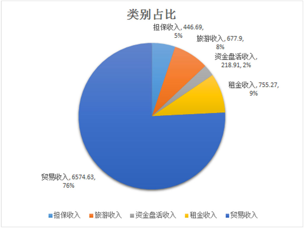 1-10月,集團(tuán)公司經(jīng)營(yíng)收入為8673.4萬(wàn)元,同比去年增長(zhǎng)337 %。其中:貿(mào)易收入6574.63萬(wàn)元,占比76%;擔(dān)保業(yè)務(wù)收入446.69萬(wàn)元,占比5%;資金盤(pán)活收入218.91萬(wàn)元,占比2%;八寨溝旅游收入677.9萬(wàn)元,占比8%;租賃收入755.27萬(wàn)元,占比9%。