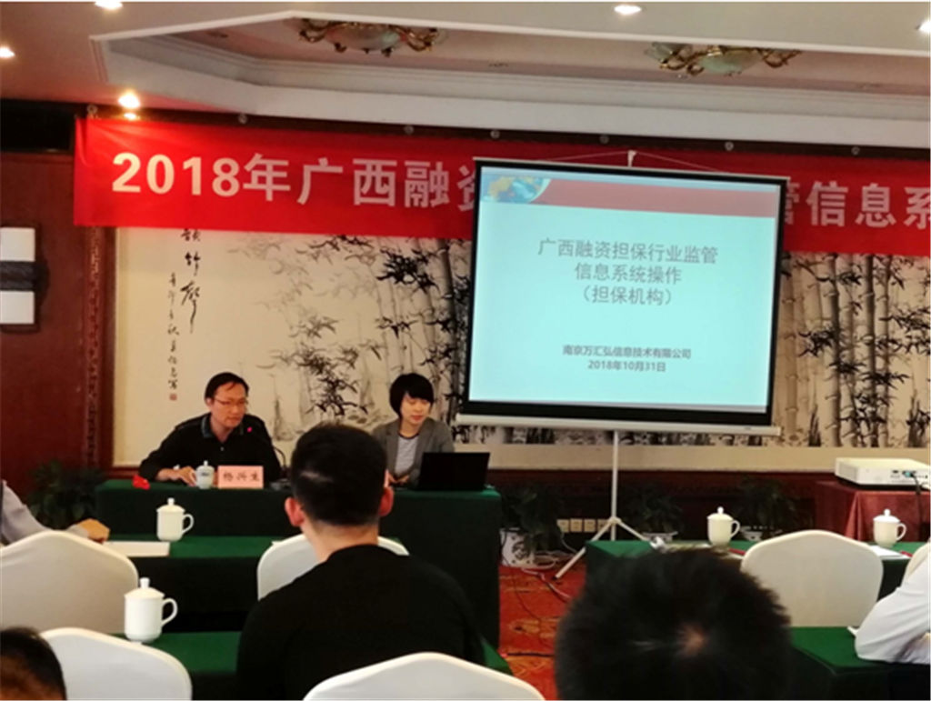 2018年10月31日,由自治區(qū)金融辦組織,在桂林榕湖飯店由系統(tǒng)設(shè)計(jì)方南京萬(wàn)匯弘信息科技有限公司負(fù)責(zé)人陳月對(duì)廣西融資擔(dān)保行業(yè)監(jiān)管信息系統(tǒng)操作進(jìn)行培訓(xùn)。         廣西濱海新城融資性擔(dān)保有限公司積極響應(yīng)區(qū)金融辦的要求,專門(mén)指...