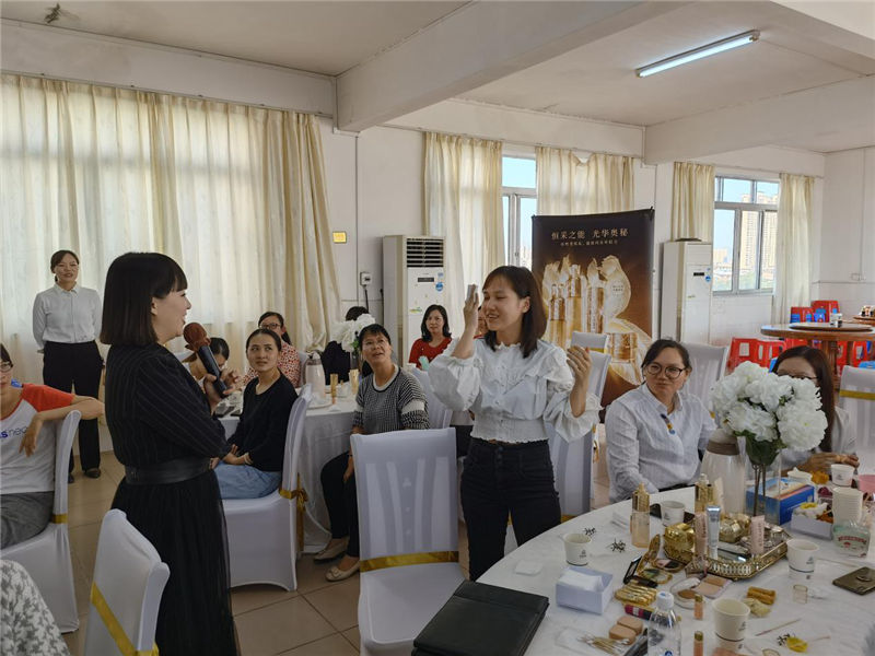 講師從保養(yǎng)護膚到上妝步驟的詳細講解,細心的展示一些日常護膚產品和體驗效果,現場還邀請女員工上臺當模特,一邊化妝一邊講解技巧,讓在場的每位員工零距離感受到了護膚與化妝的魅力。講座還準備了特別小禮品,作為對參加現場競猜環(huán)節(jié)的獎勵,現場抽取了三名幸運兒獲得精美禮品,氣氛異?;钴S。