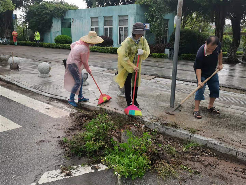 活動當(dāng)天,煙雨朦朧。志愿者們有的拿著鏟子,有的拿著掃把,有的拿著垃圾簍,冒雨干起活來。
