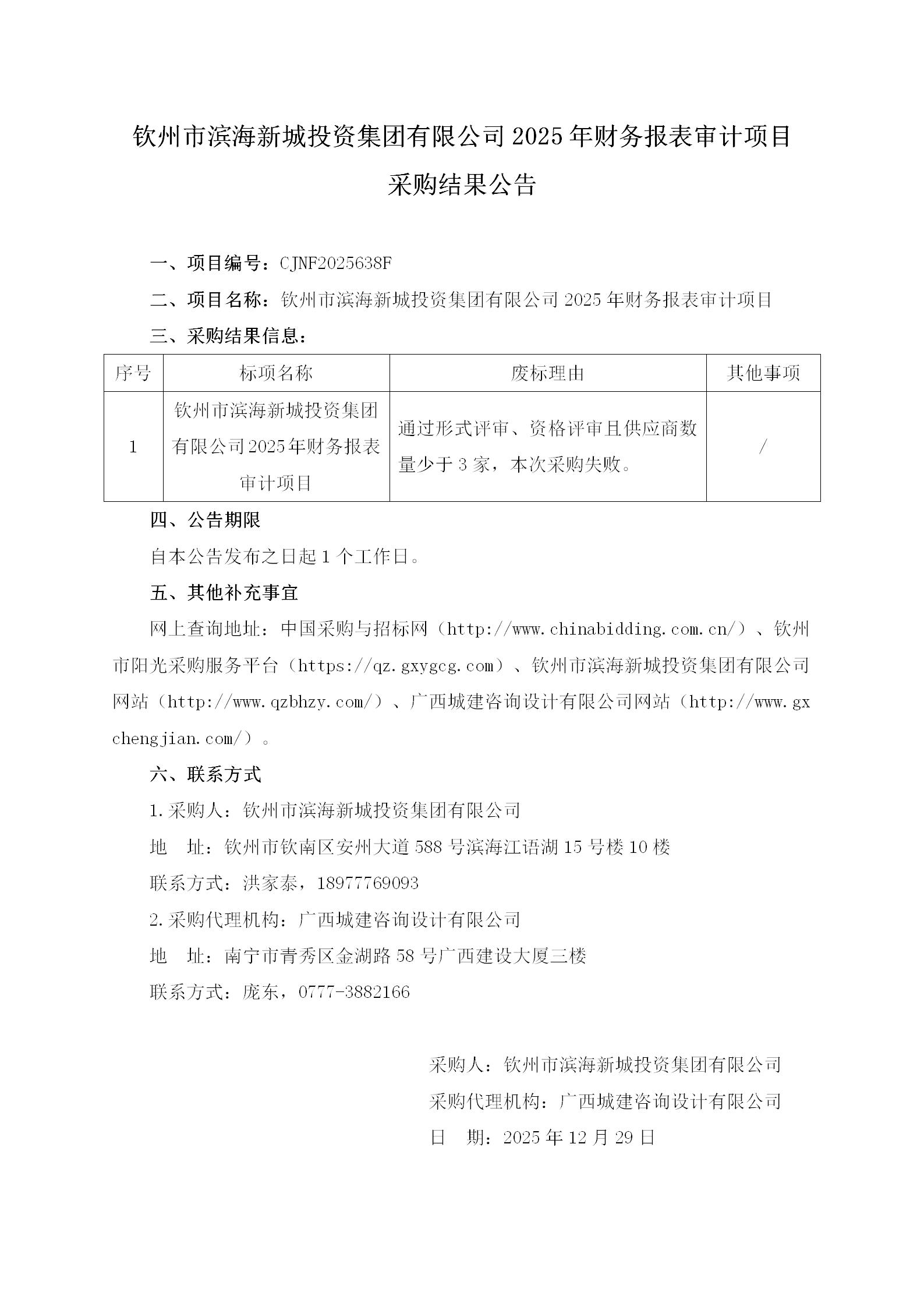 欽州市濱海新城投資集團有限公司2025年財務(wù)報表審計項目采購結(jié)果公告