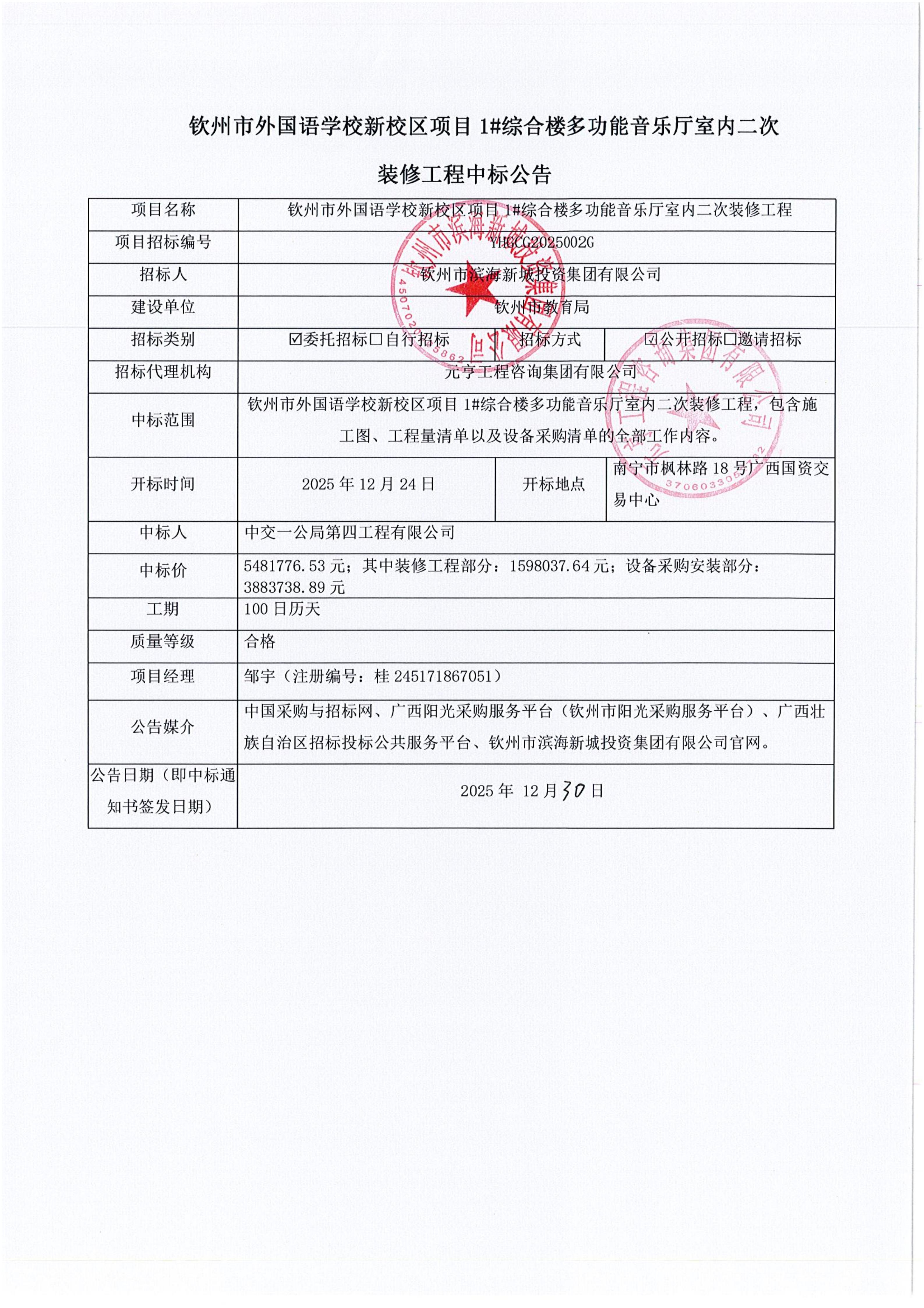 欽州市外國語學(xué)校新校區(qū)項目1#綜合樓多功能音樂廳室內(nèi)二次裝修工程中標公告