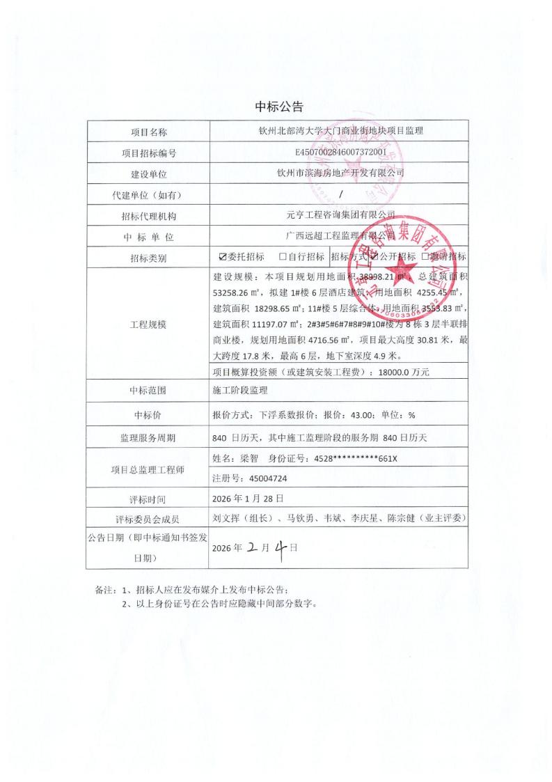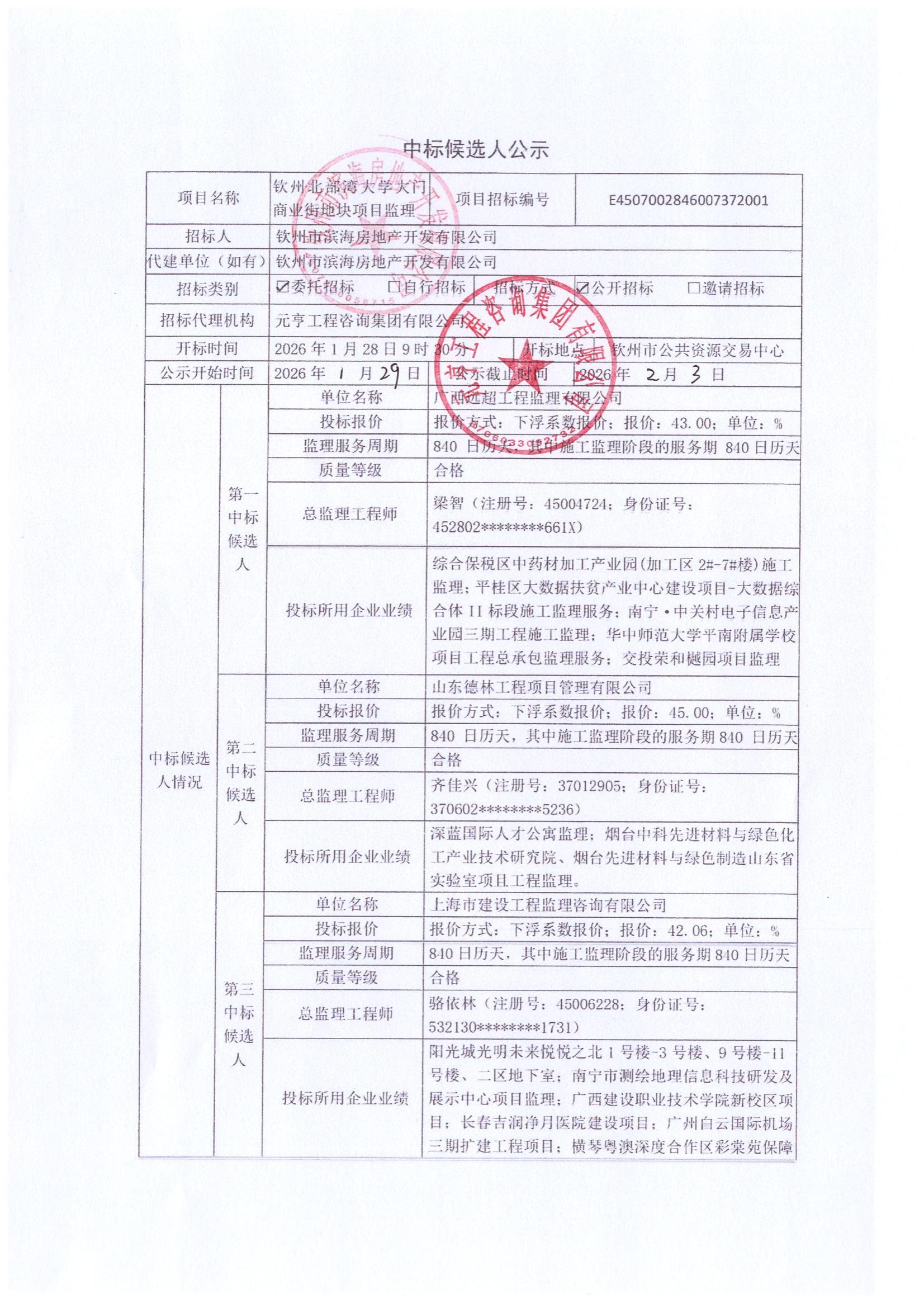 中標候選人公示(欽州北部灣大學(xué)大門商業(yè)街地塊項目監(jiān)理)