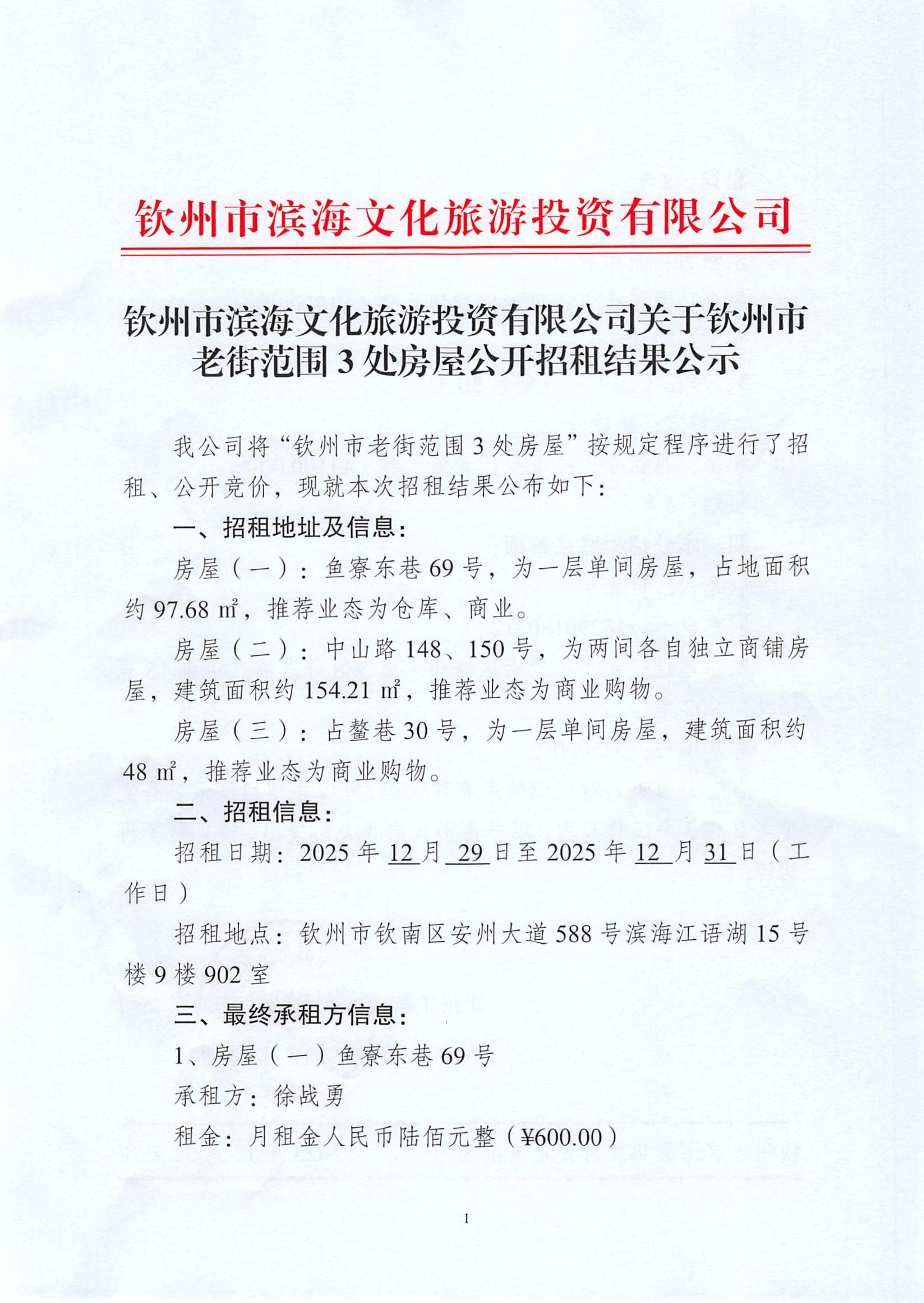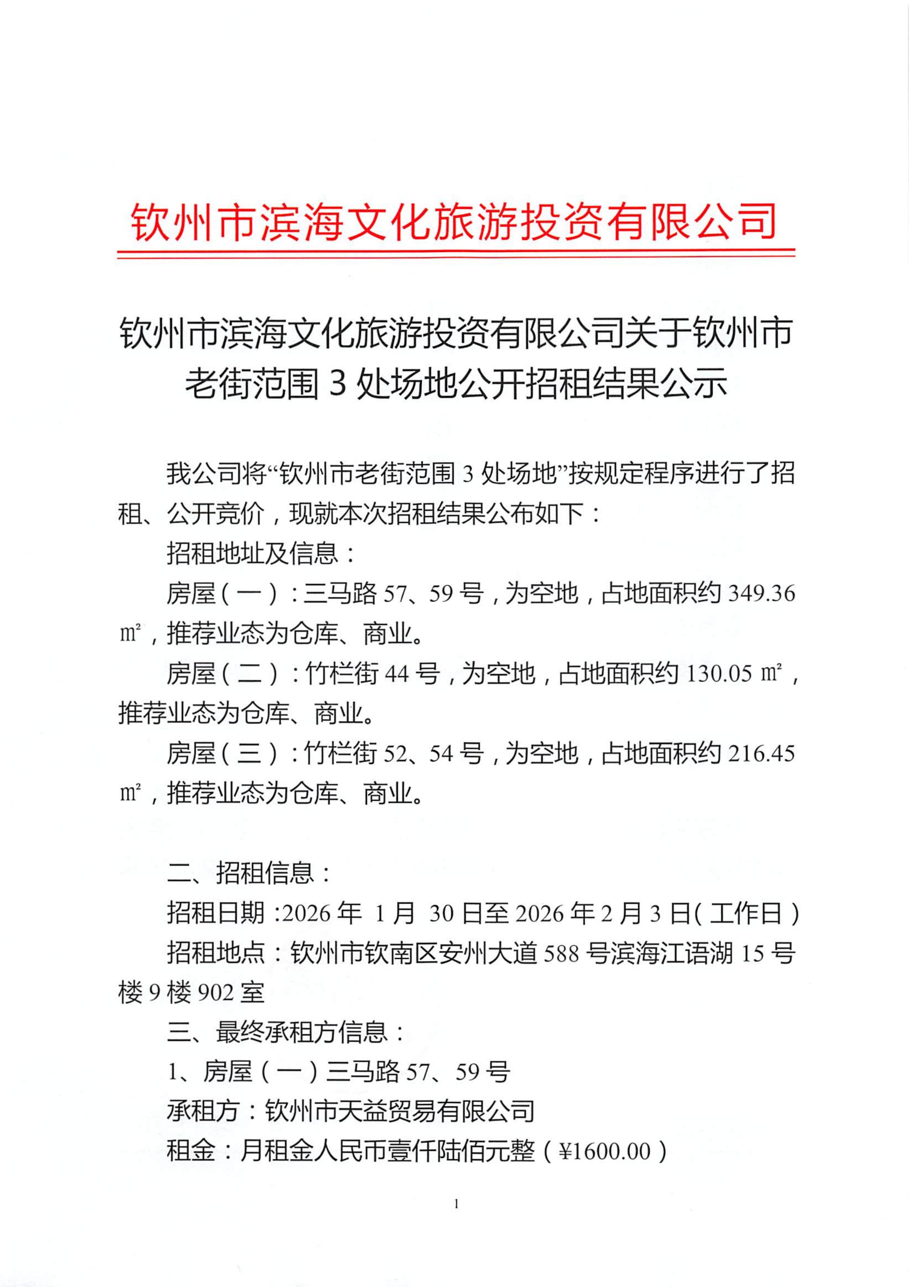 欽州市濱海文化旅游投資有限公司關(guān)于欽州市老街范圍2處房屋公開招租結(jié)果公示
