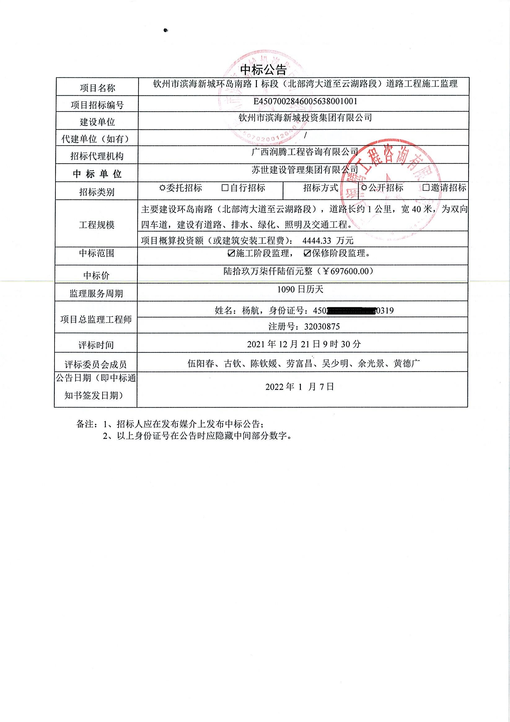 中標(biāo)公示-欽州市濱海新城環(huán)島南路Ⅰ標(biāo)段(北部灣大道至云湖路段)道路工程施工監(jiān)理