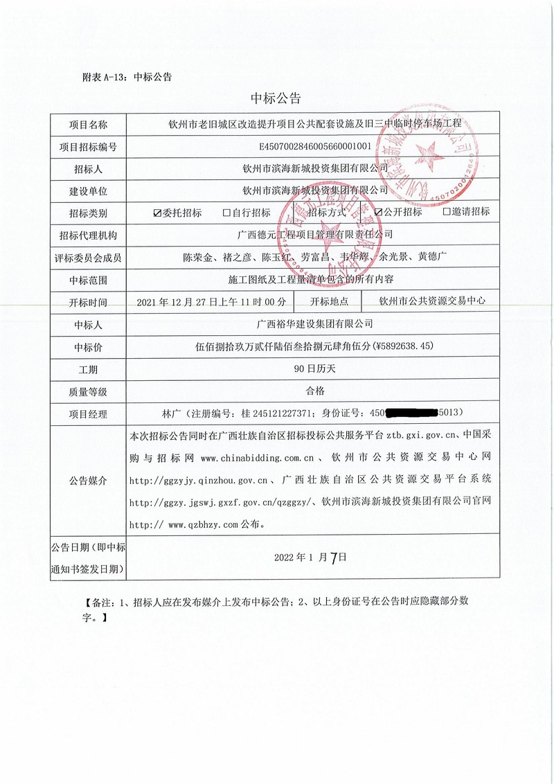 中標(biāo)公告-欽州市老舊城區(qū)改造提升項目部分房屋修繕及景觀工程設(shè)計-施工總承包(EPC)