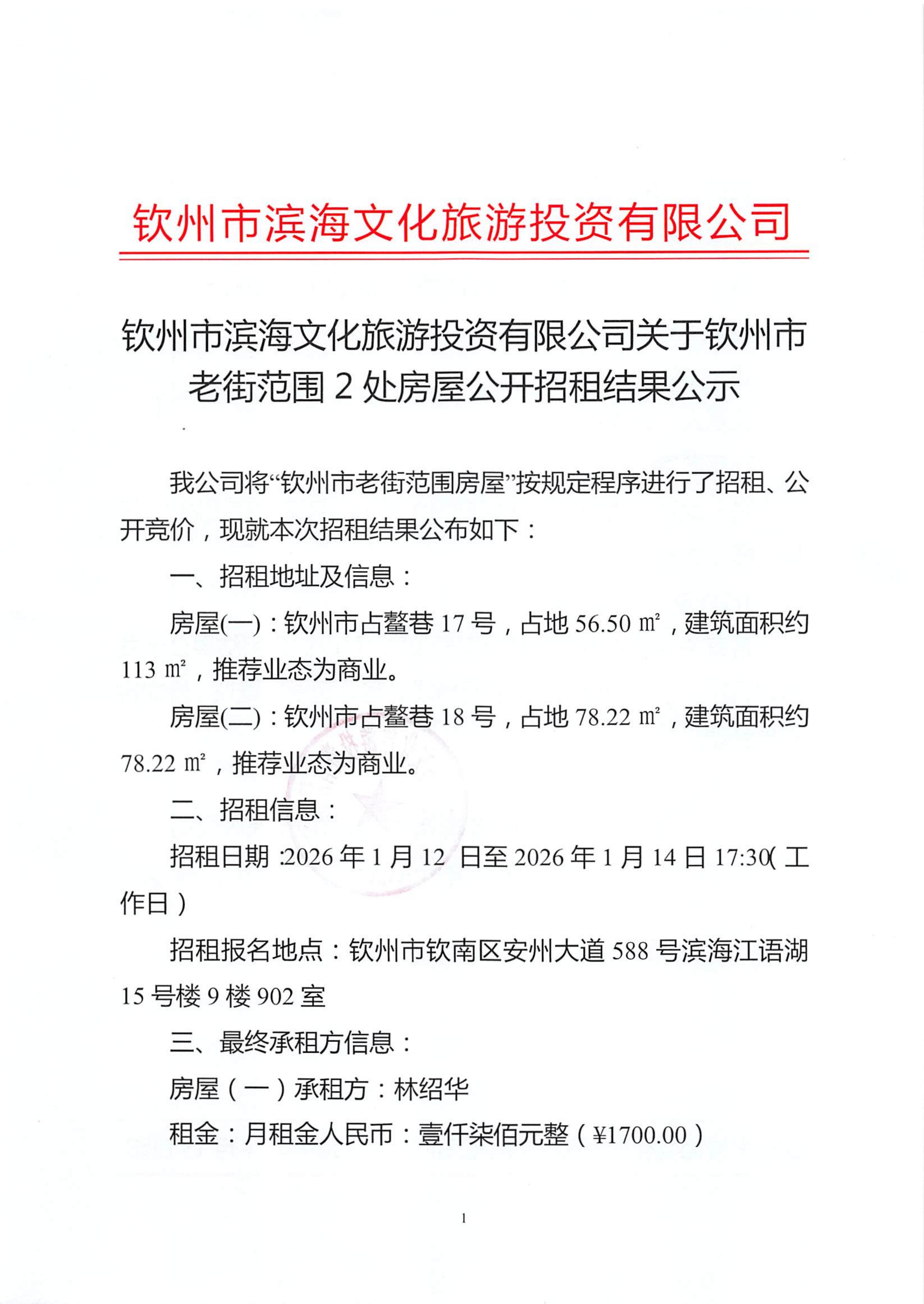 欽州市濱海文化旅游投資有限公司關(guān)于欽州市老街范圍2處房屋公開招租結(jié)果公示