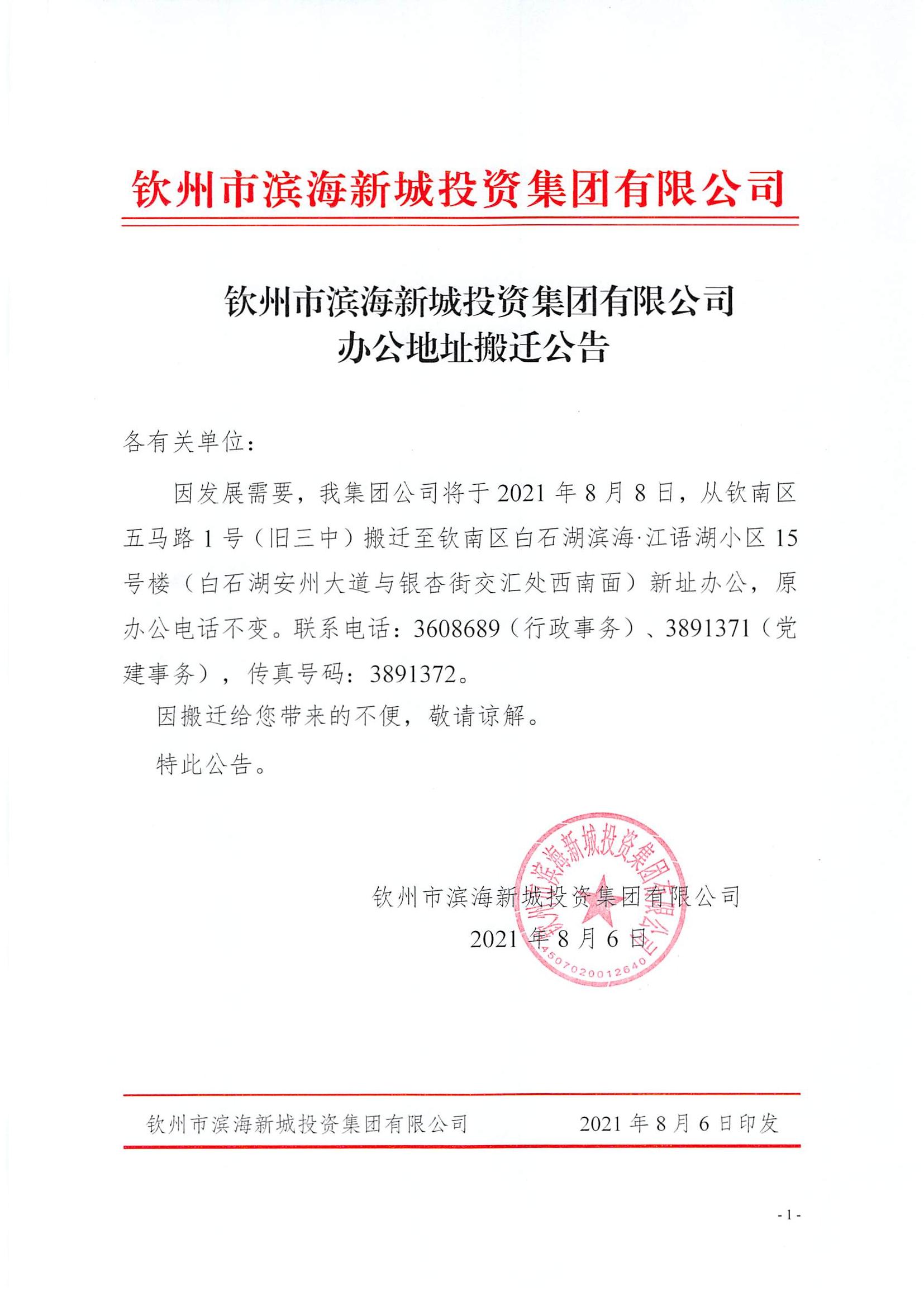 欽州市濱海新城投資集團有限公司辦公地址搬遷公告