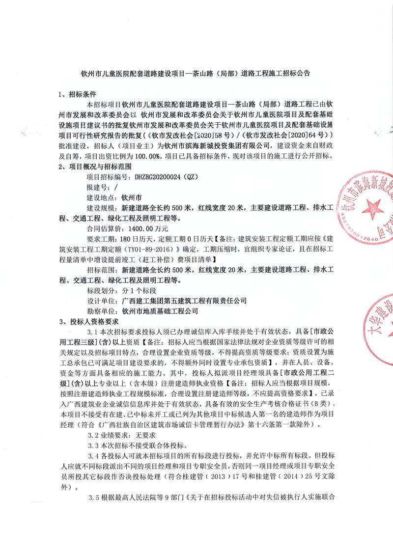 欽州市兒童醫(yī)院配套道路建設(shè)項(xiàng)目—茶山路(局部)道路工程施工招標(biāo)公告