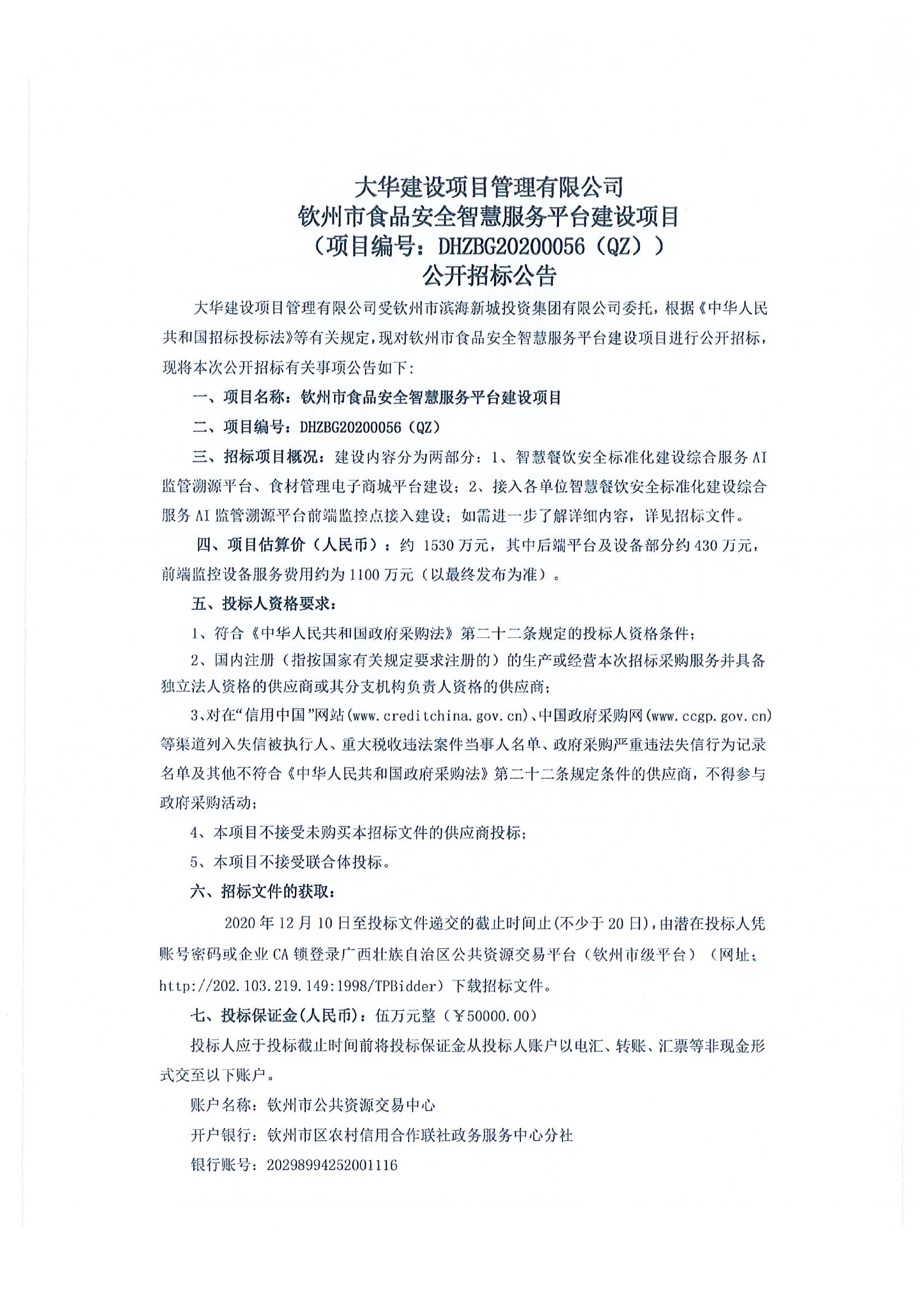 欽州市食品安全智慧服務(wù)平臺建設(shè)項(xiàng)目公開招標(biāo)公告
