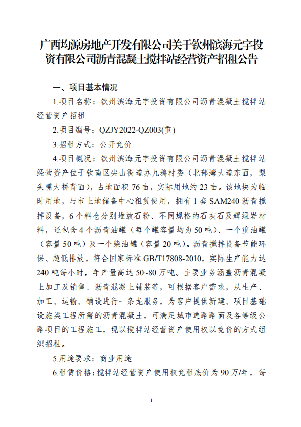廣西均源房地產(chǎn)開發(fā)有限公司關(guān)于欽州濱海元宇投資有限公司瀝青混凝土攪拌站經(jīng)營(yíng)資產(chǎn)招租公告