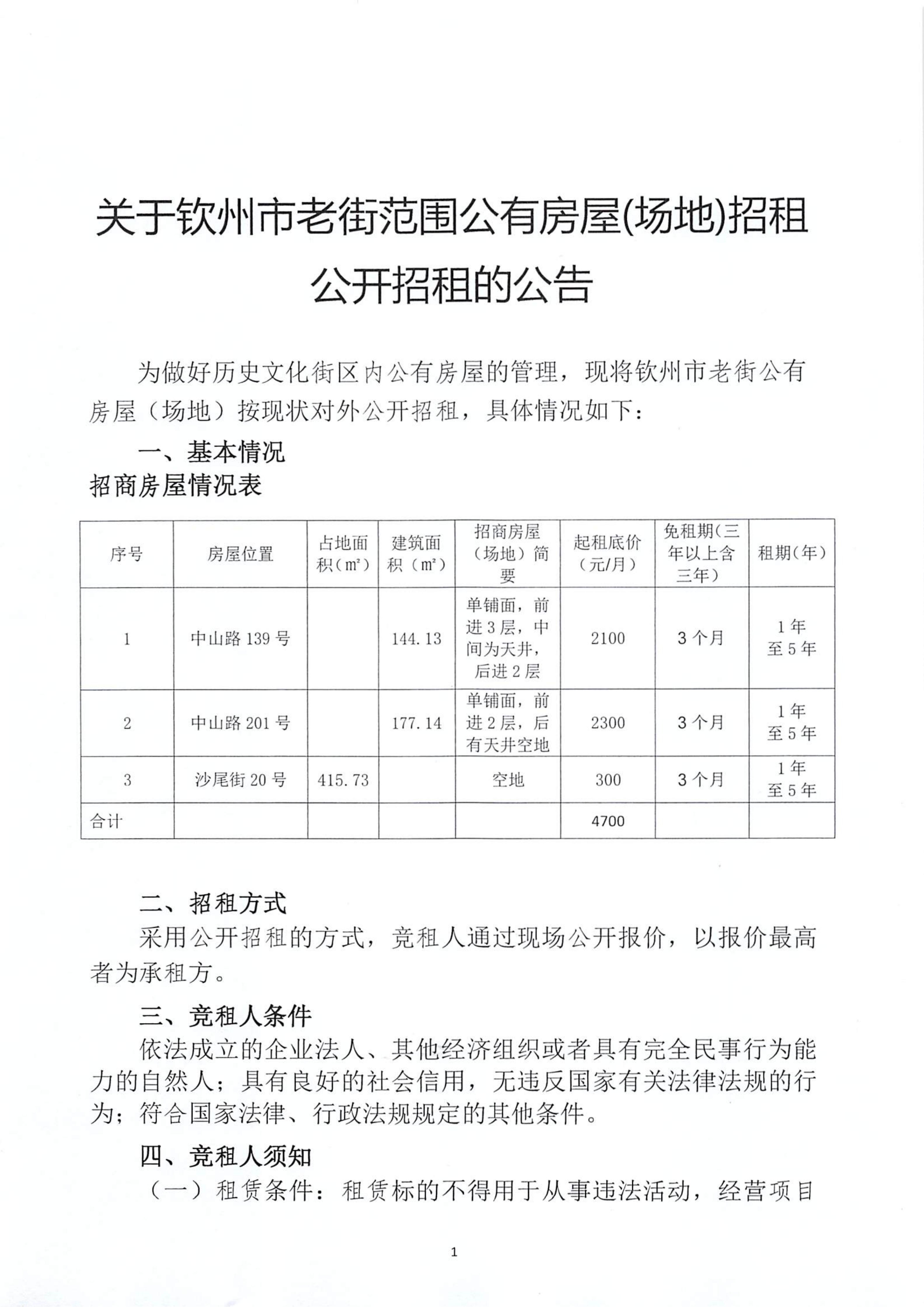 關(guān)于欽州市老街范圍公有房屋(場地)招租公開招租的公告(中山路139號、中山路201號、沙尾街20號)